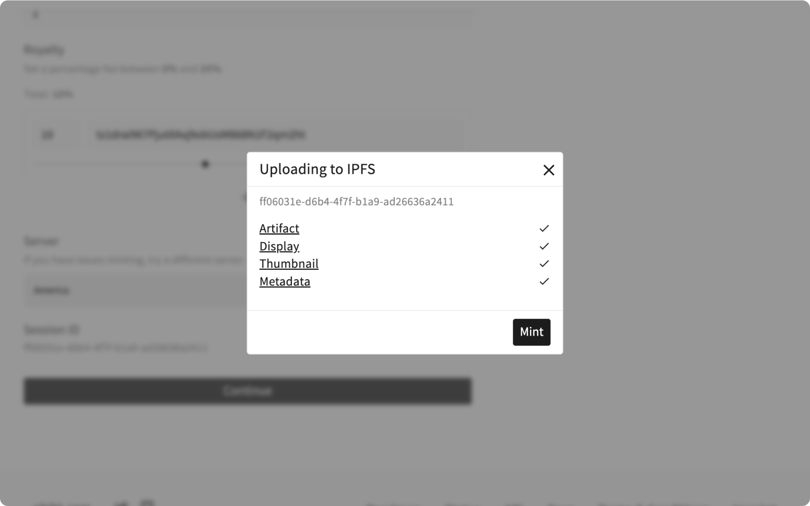Don’t forget to choose how many editions of the work you’d like to mint, and to choose the percentage of resale royalties you’d like to receive in your synced wallet if a collector chooses to sell your work. ... Don’t worry you’re almost there!