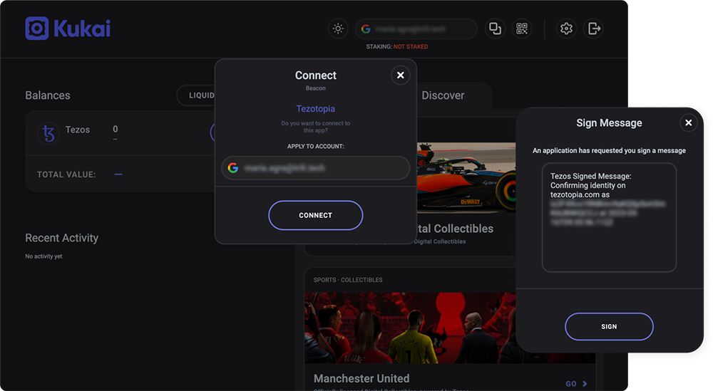 Tezotopia will now trigger a request to sync with your wallet; you can approve this request directly from within your Kukai wallet. The approval process requires you to log in to your Google account again.